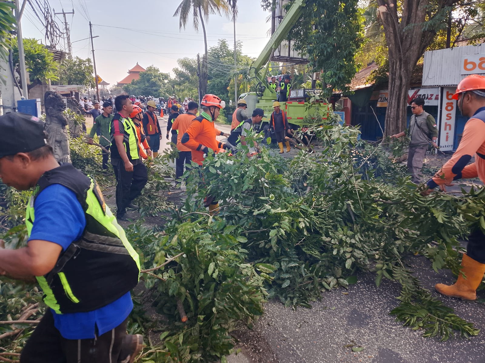 TRC PB BPBD Buleleng bersama Kabid KL melakukan perompesan pohon perindang di Desa Sangsit, Banjar Tegal, Kecamatan Sawan, Sabtu (7/2/2026). Kegiatan ini berkolaborasi dengan DLH, Balai Jalan, Perbekel Sangsit, Kadus Banjar Tegal, dan Trantib Kecamatan Sawan.