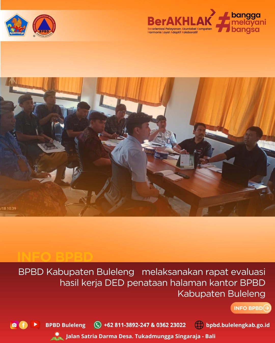 Halo sobat tangguh pada hari ini Kamis, (18/9) - BPBD Kabupaten Buleleng melaksanakan rapat evaluasi hasil kerja DED penataan halaman kantor BPBD Kabupaten Buleleng. Rapat ini berlangsung pada pukul 10.00 Wita hingga selesai di Ruang Kalaksa Kab. Buleleng.