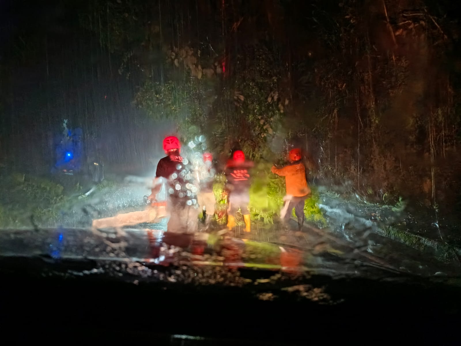 Hujanpun Tim Reaksi Cepat Penanggulangan Bencana BPBD Buleleng tetap Tangani Dahan Pohon Patah di Jalan Singaraja-Gitgit