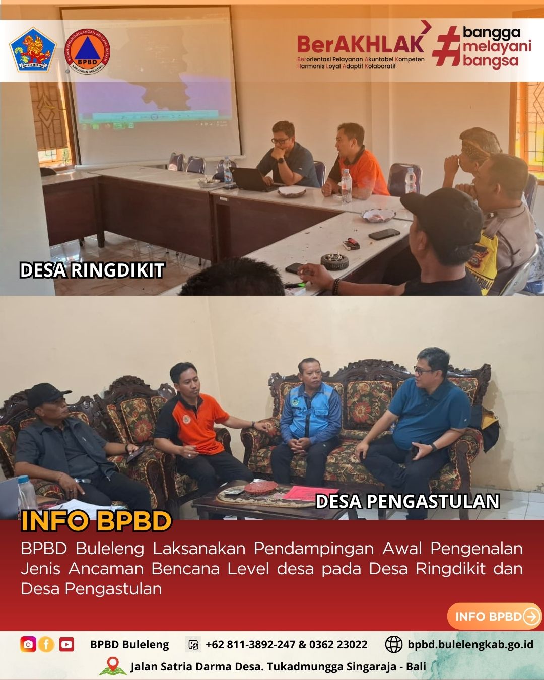 Kamis, (25/9) - BPBD Kabupaten Buleleng melalui Kabid Pencegahan dan Kesiapsiagaan melaksanakan pendampingan awal pengenalan jenis ancaman bencana level desa di Desa Ringdikit dan Desa Pengastulan. Kegiatan ini bertujuan untuk meningkatkan kesadaran dan kesiapsiagaan masyarakat desa dalam menghadapi potensi bencana.