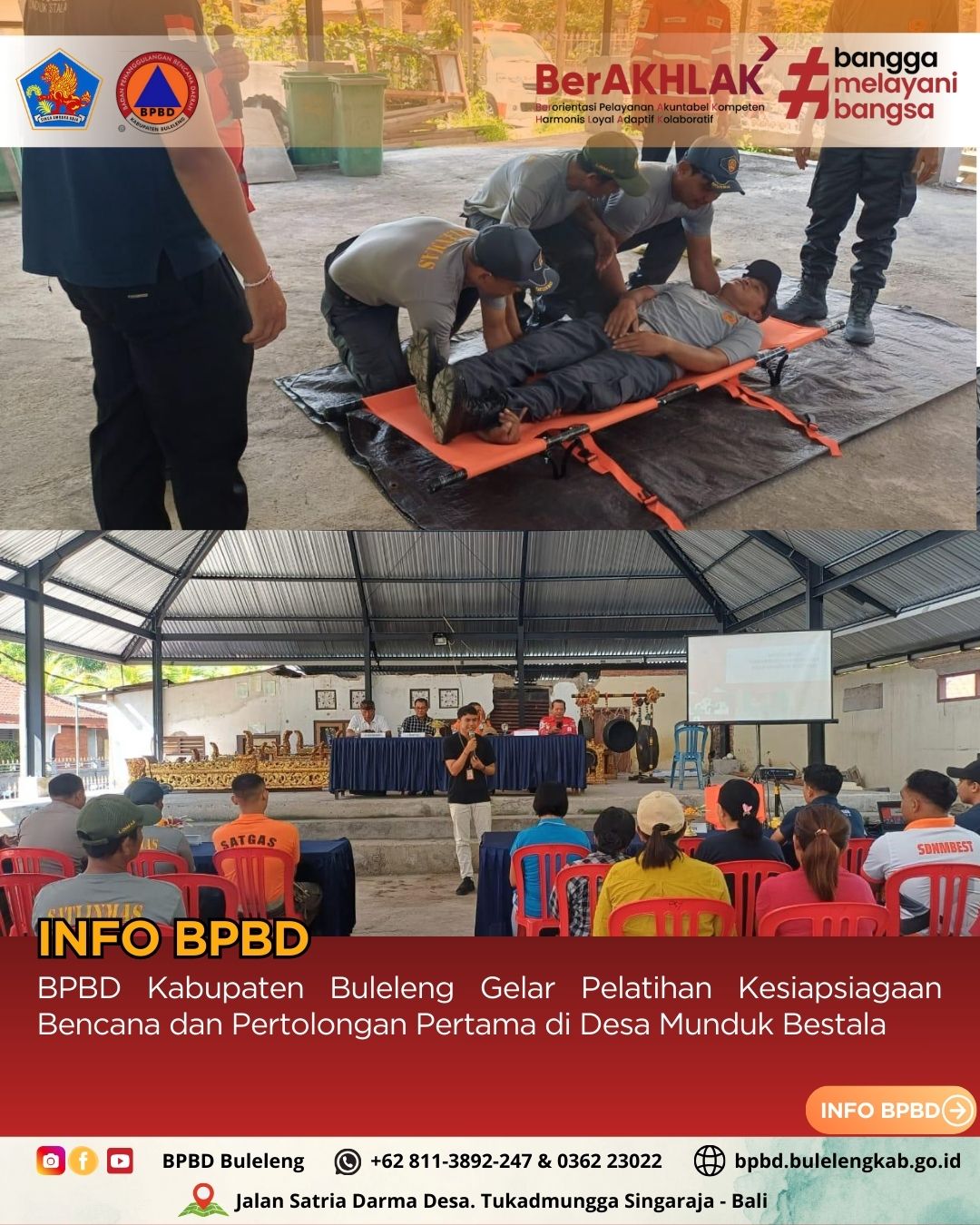 Jumat, (26/9) - BPBD Kabupaten Buleleng Menggelar Pelatihan Kesiapsiagaan Bencana dan Pertolongan Pertama di Desa Munduk Bestala. Kegiatan ini dibuka oleh Perbekel Munduk Bestala pada pukul 08.30 WITA dan dihadiri oleh berbagai pihak, termasuk Kasi Trantib Satpol PP Kecamatan Seririt, Kelian Adat, Bhabinkamtibmas, Linmas, PKK, dan Kelompok Dasa Wisma.