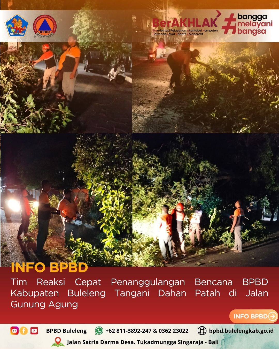 Rabu, (24/9) - Tim Reaksi Cepat Penanggulangan Bencana BPBD Kabupaten Buleleng dibantu juga Dandru TRC-PB Regu yang sedang lepas piket Putra Agra Kusuma, melaksanakan penanganan dahan patah di Jalan Gunung Agung, Kelurahan Banjarpaketan. Pohon jenis tanjung dengan diameter 30 cm patah dan menutup setengah badan jalan, namun beruntung tidak ada kerugian yang dilaporkan.