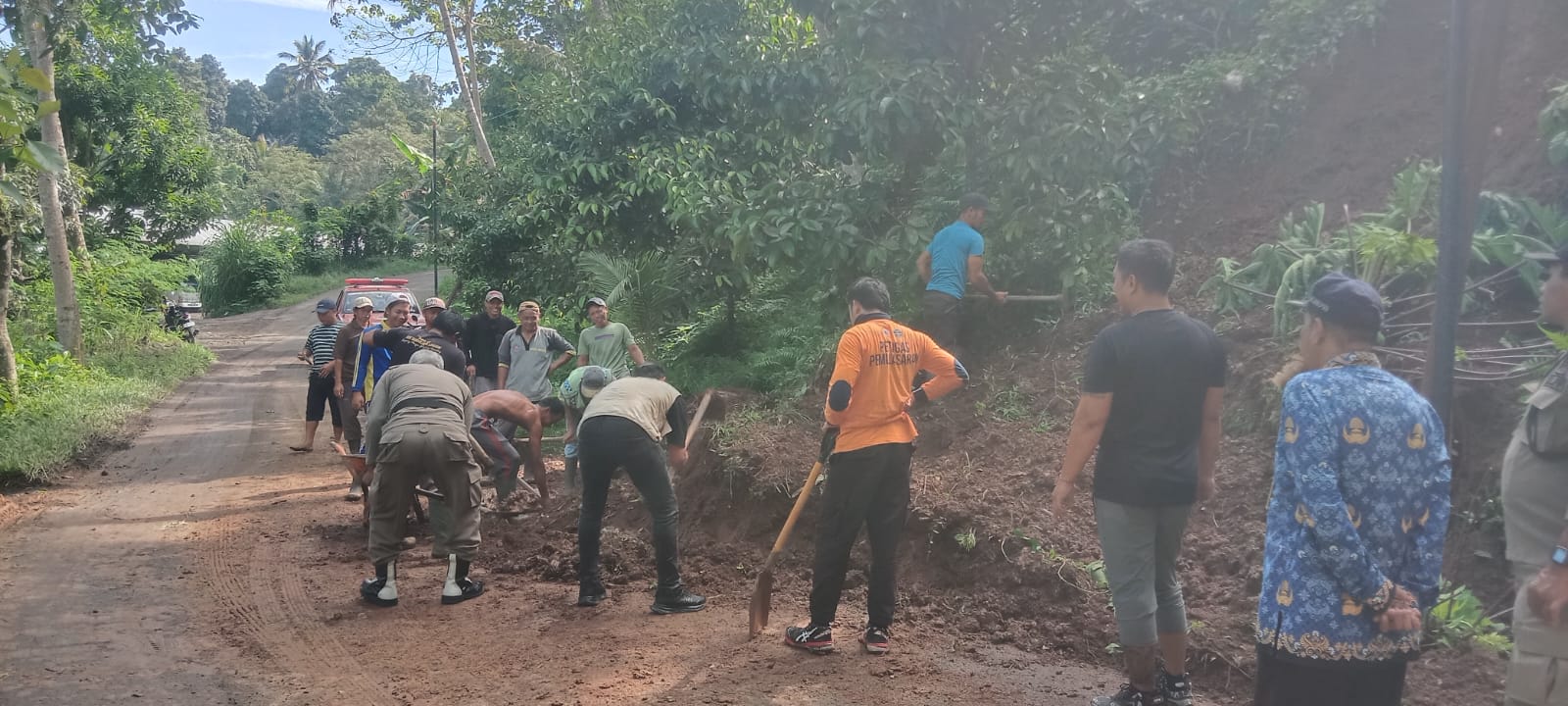 Pekerjaan pembersihan sementara dilakukan secara manual dengan melibatkan TRC BPBD, Petugas Kebersihan Jalan Dinas PUTR, Satpol PP Kecamatan Sawan, dan beberapa warga. Akses jalan sementara sudah dapat dilalui oleh kendaraan roda 4.