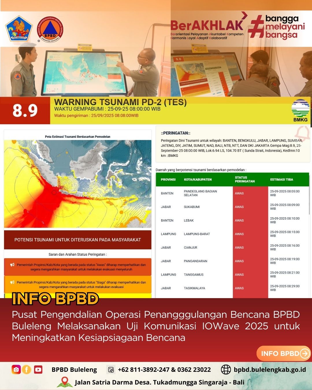 Kamis, (25/9) - Pusdalops PB BPBD Kabupaten Buleleng mengikuti Uji Komunikasi IOWave 2025 di Kantor BPBD Kabupaten Buleleng. Uji komunikasi ini disimulasikan dengan skenario gempabumi besar dengan magnitudo 9.0.