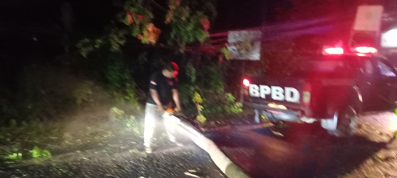 Sebuah pohon kelapa dan pohon ketapang d tumbang di desa Kalibukbuk dan Desa Tukadmungga yang menutupi akses jalan, pada Senin (12/1/2026) pukul 22.00 Wita. Pohon tumbang disebabkan oleh angin kencang dan hujan.